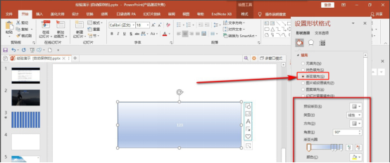 2、这时右侧会弹出设置形状格式窗口,勾选【渐变填充】,这时下方会出现对应的一些参数。