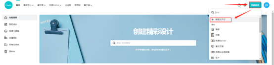 3、登陆成功之后,进入在线设计主界面,点击【创建设计】,在其下拉菜单中选择需要设计场景有海报、传单、演示文稿等等,这里选择【自定义尺寸】。