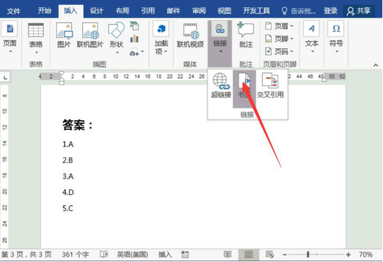 2.然后,我们以设置第一道题的书签超链接为例进行讲解。先将光标定位到第一道题答案的后面,再点击word“插入”菜单中的“链接”,并从其下拉菜单中点击“书签”。