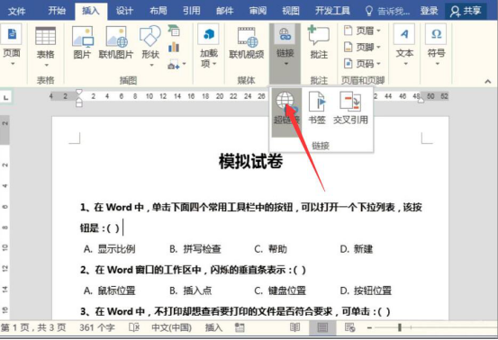 4.接下来,回到模拟试卷的第一道题。将光标定位到题目的末尾处,再点击word“插入”菜单中的“链接”,并从它的下拉菜单中点击“超链接”。