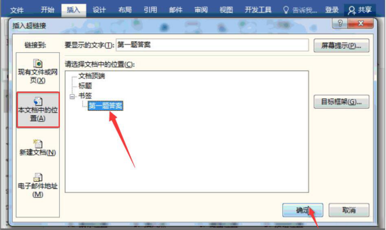 5.word便会弹出插入超链接的窗口,我们点击“本文档中的位置(A)”,并点选我们刚才设置的书签,再点击“确定”按钮。