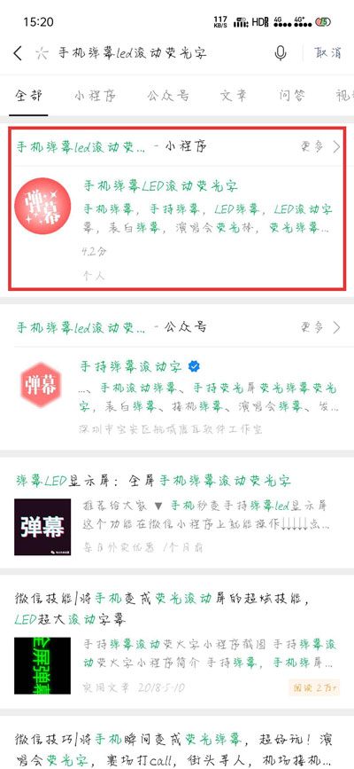 2、搜索【手机弹幕LED滚动荧光字】小程序,点击搜索结果中的【手机弹幕LED滚动荧光字】小程序;