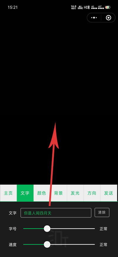 5、切换到【文字】页面,在文字输入框中输入需要显示的文字,也可以选择字体、背景、发光、滚动的方向等等;