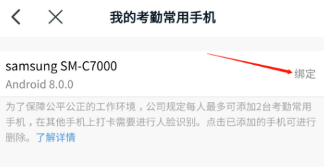 如图,选择考勤常用手机,点击【绑定】即可。