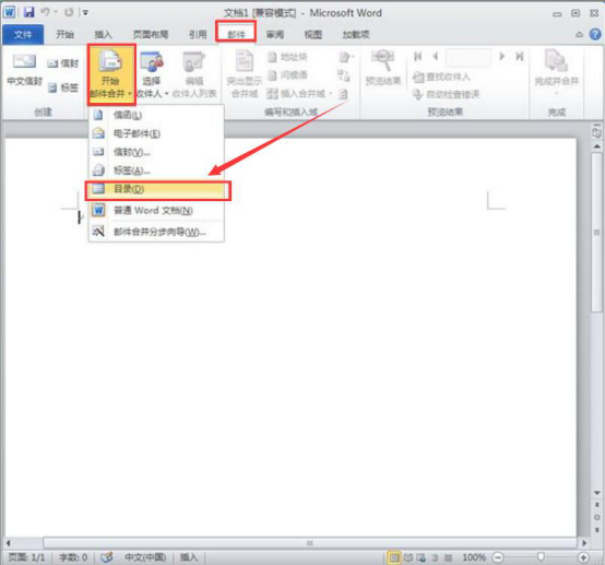 2.然后,新建一个word文档。点击“邮件”菜单中的“开始邮件合并”,并从其下拉菜单中点击“目录”。