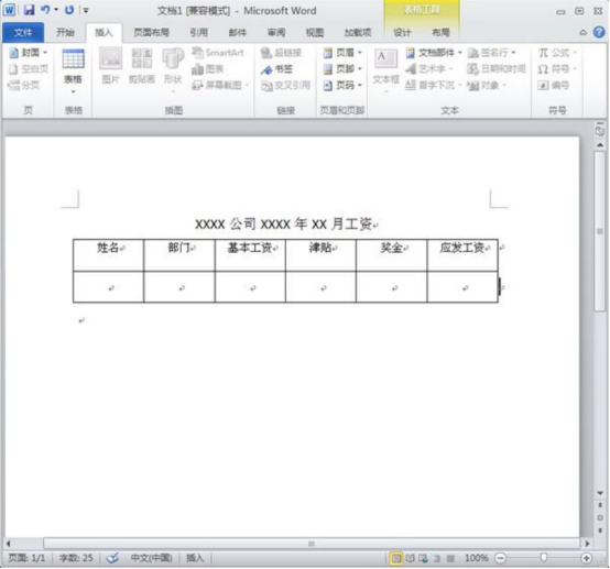 3.根据excel制作的工资表对应在word中制作工资条,如下图所示。