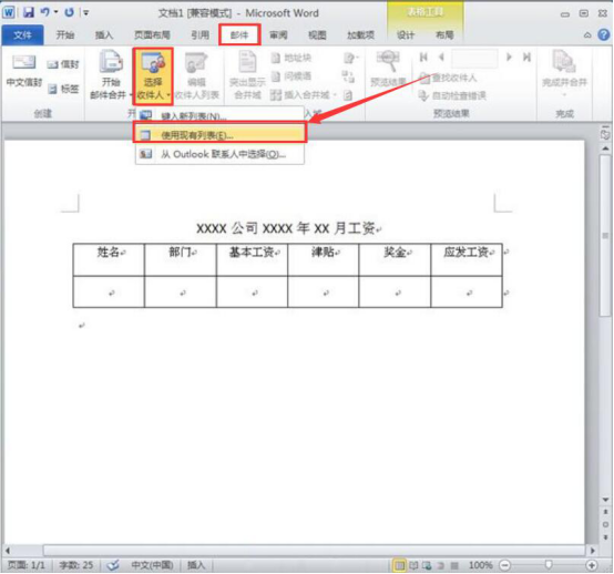 4.接下来,点击“邮件”菜单中的“选择收件人”,并从其下拉菜单中点击“使用现有列表”。