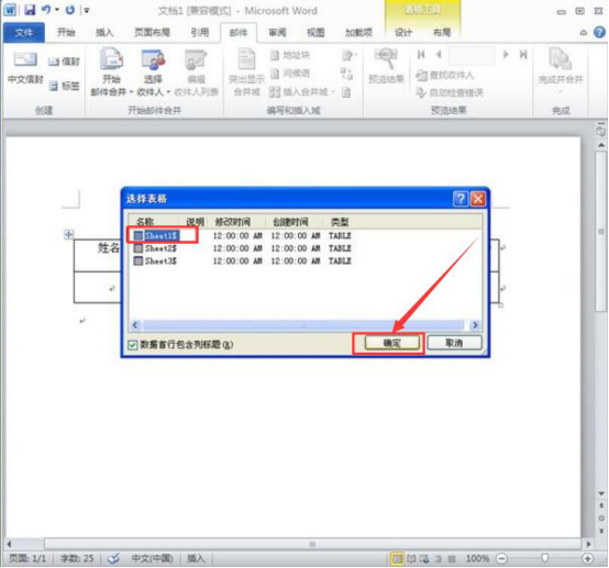 6.接着,继续自动弹出“选择表格”窗口,点击“sheet1$”表格,再点击“确定”按钮。