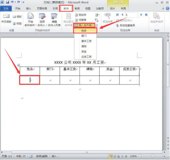 7.将鼠标光标定位在姓名对应的单元格中,并点击“邮件”菜单中的“插入合并域”,从其下拉菜单中点击“姓名”。同样的,其他几项工资条内容对应的单元格也按照这样的方法插入到对应的合并域。