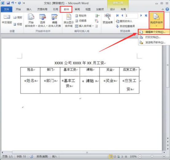8.完成上一步操作后,点击“邮件”菜单中的“完成并合并”,并从其下拉菜单中点击“编辑单个文档”。