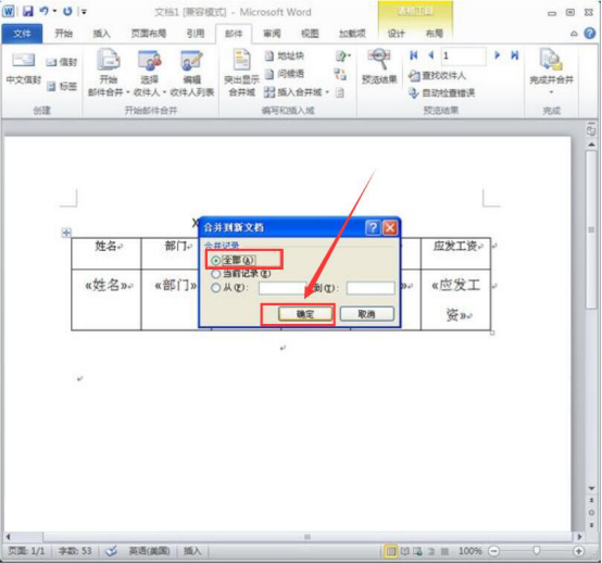 9.此时,word便会弹出如下图的“合并到新文档”的小窗口。在此窗口中点选“全部”,并点击“确定”按钮。