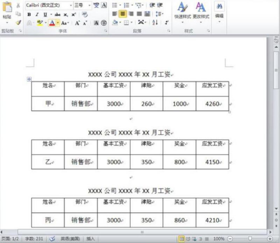 10.最后,在word中便可以看到我们想要的工资条都制作完成了。