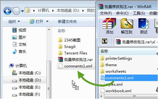 4、将做过替换修改的【comments1.xml】文件拖动到原压缩文件中替换更新。