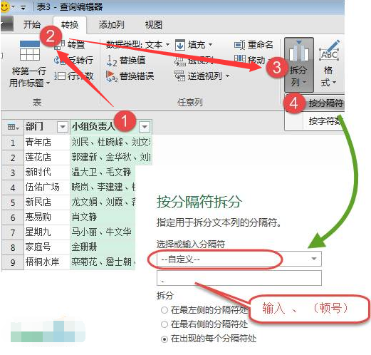 2、弹出查询编辑器窗口,选中小组负责人所在列的列标,然后点击上方菜单中【转换】,之后依次点击【拆分列】-【按分割符】。在按分隔符对话框中选择【自定义】,然后在下方文本框内输入【、】,拆分方式选择“在出现的每个分隔符处”。