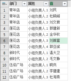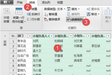 4、常按Ctrl键,然后依次选中小组负责人分出的所有列,在查询编辑器窗口中依次点击【转换】-【逆透视列】。