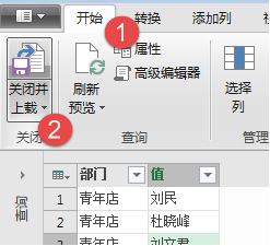 6、将属性列删除,然后点击上方菜单中的【开始】,在最左侧找到并点击【关闭并上载】。