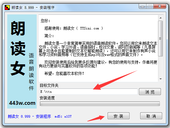 5.进入朗读女安装程序,将安装路径设置【tts】文件夹中,然后点击【确定】。