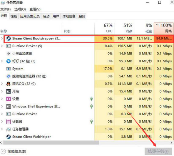 1.首先,我们看看电脑是否运行了占用网络资源多的程序。打开任务管理器,可以看到Steam应用程序正在高速下载游戏,我们点选它,再点击“结束任务”按钮,即可解决小黑盒加速器加速后延迟高波动大的问题。