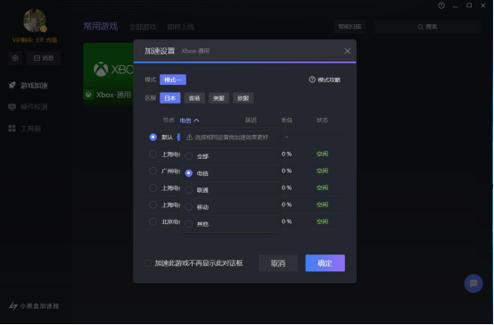 1.如果在网络监控的窗口中,看到的是服务器延迟高波动大,那么就可以手动切换小黑盒加速器加速的节点。在“加速设置”窗口中,选择相同运营商和最近的节点,这样加速的效果会更好。