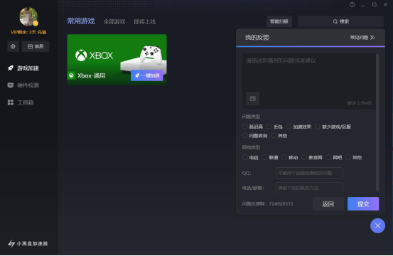 3.在弹出的反馈窗口中,将小黑盒加速器延迟高波动大的情况详细描述,并点击“提交”按钮,等待客服处理。