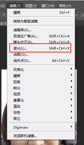 3.找到顶部工具栏中的滤镜选项,打开下拉菜单,找到“液化”功能