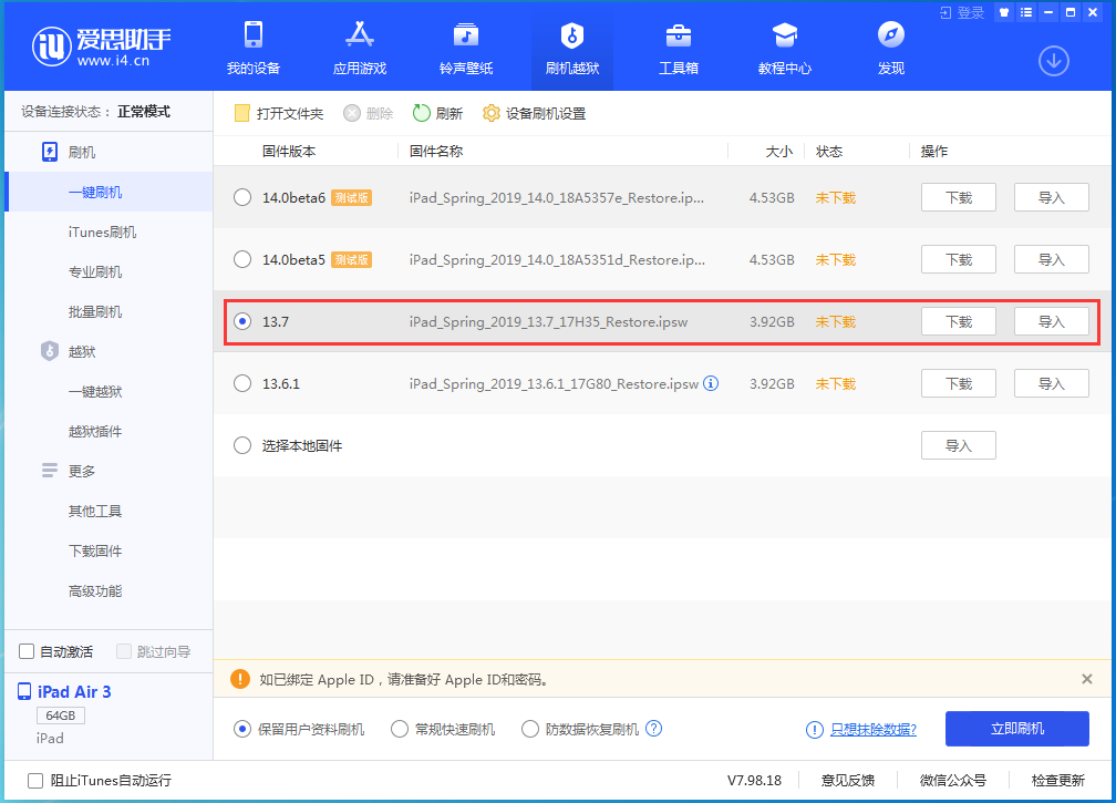 2、在可刷版本中选择iOS版本,点击【立即刷机】,爱思助手会自动下载固件并刷机,