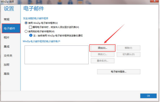 4.进入WinZip选项的设置页面,因为我们是想通过邮箱将文件发送给别人,所以,这里切换至“电子邮件”选项卡界面,点击“添加(A)”按钮。