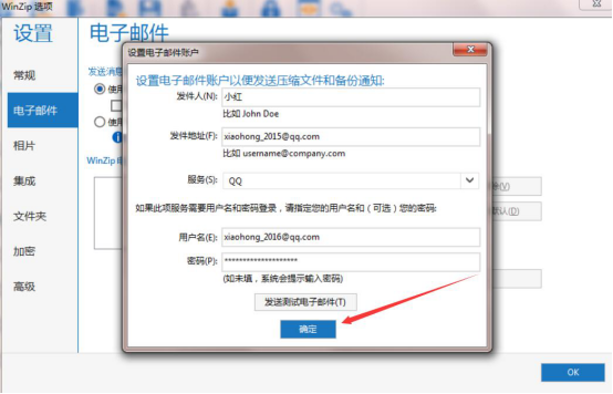 5.接下来,WinZip会弹出如下图的“设置电子邮件账户”窗口。我们输入电子邮箱的账户信息,点击“确定”按钮。
