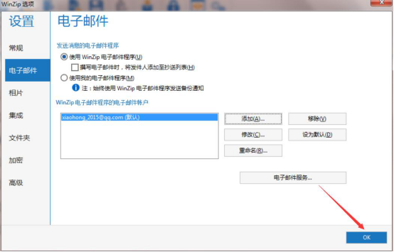 6.此时,我们可以在WinZip选项的“电子邮件”选项卡界面中,看到电子邮箱已经在列表中了,点击右下方的“OK”按钮。