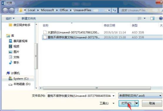 5.接下来,word会弹出如下图的窗口,我们单击需要恢复的未保存的文件,并点击“打开”按钮。