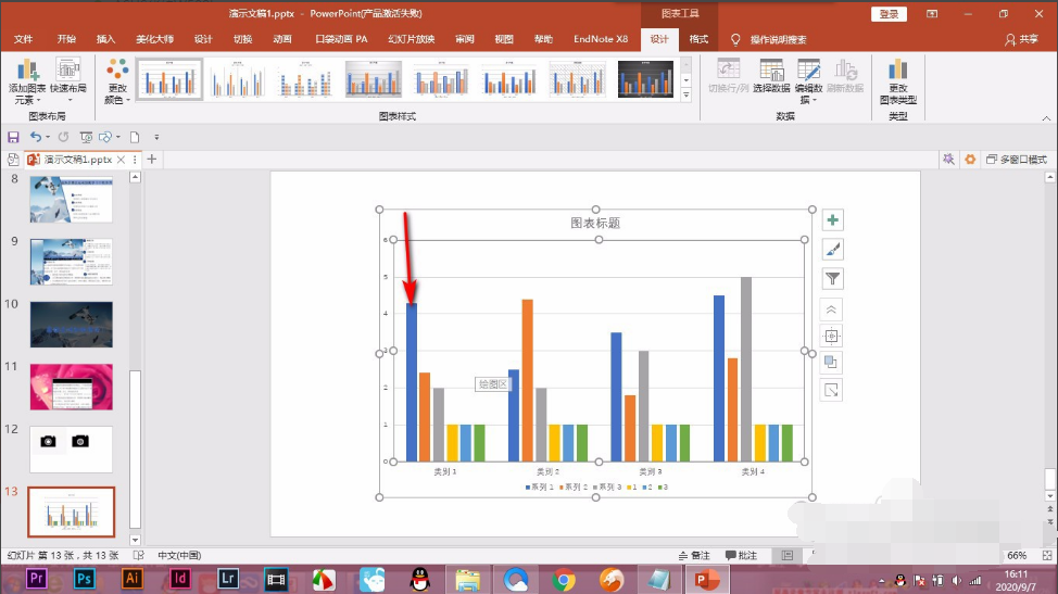 2.我们点击选中柱形图,它就会将同种颜色的柱状图全部选中,这不是我们需要的。