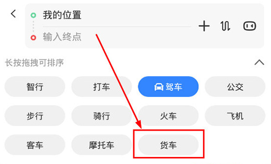进入出行线路设置界面,如图,点击右侧下拉箭头,设置出行方式,选择【货车】,