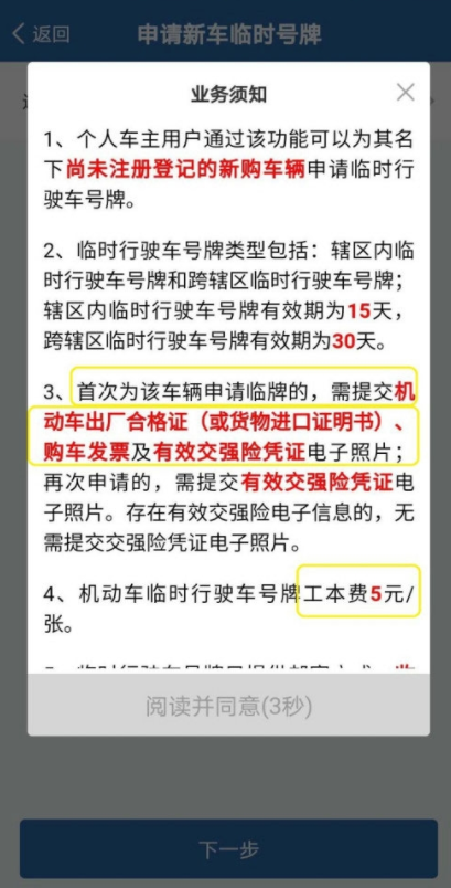 弹出对话框,阅读提示,点击同意,首次申请需要准备车辆出厂合格证、购车发票以及有效强险保单,