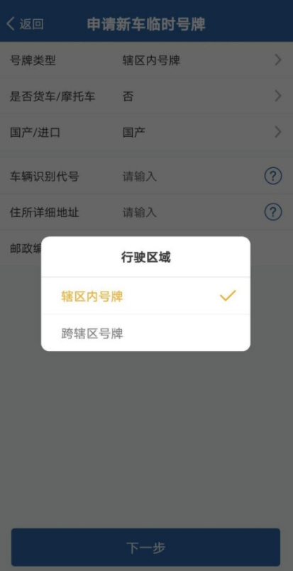 现在点击选择【行驶区域】,可以选择【辖区内号牌】和【跨辖区号牌】,