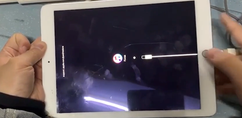 4.这时候还得同时按住电源键,长按一段时间后,出现苹果图标后,继续按住home键直到ipad出现连接画面。