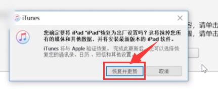 6.然后提示接下来会恢复出厂设置,也就是说ipad里的东西可能会被清除,没办法,只能选择恢复并更新