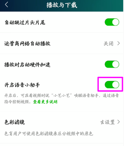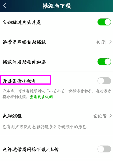 进入设置界面,点击【播放与下载】选项,然后找到【开启语音小助手】,点击它,