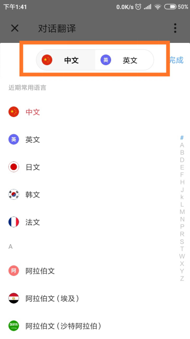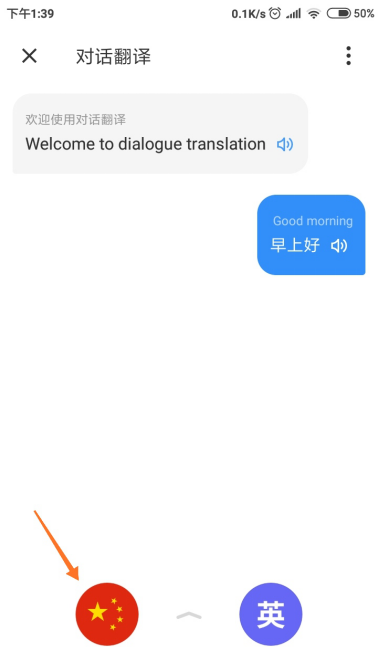 2、进入到对话翻译界面,在这个界面下方,软件提供了两种语言的互翻功能。比如图中为中英文互翻,点击中文图标。