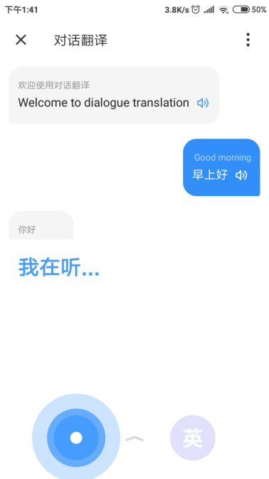 5、同样的点击右侧英语图标,进入语音界面按住后说两句英语,它也会时时翻译成中文,有点翻译器的意思。