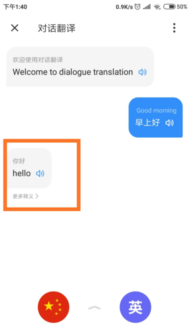 4、这时中文“你好”就会被实时翻译成英语“Hello”,同时软件会自动播放标准读法。