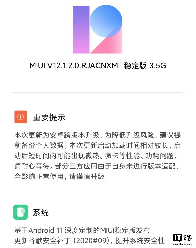 小米提醒称,此次更新为安卓跨版本升级,为降低升级风险,建议提前备份个人数据。本次更新启动加载时间相对较长,启动后短时间内可能出现微热、微卡等性能、功耗问题,请耐心等待。部分三方应用由于自身未进行版本适配,会影响正常使用,请谨慎升级。