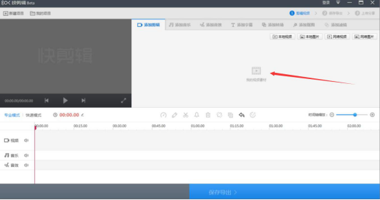 1.首先,我们将快剪辑打开。切换至“添加剪辑”界面,点击空白位置将需要调整播放速度的视频导入。