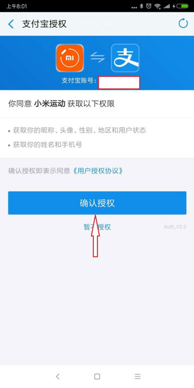 5、自动跳转到支付宝页面后,点击【确定授权】按钮,即可将小米运动和支付宝账号绑定。