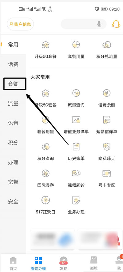 2、接着在左侧选择【套餐】一项;