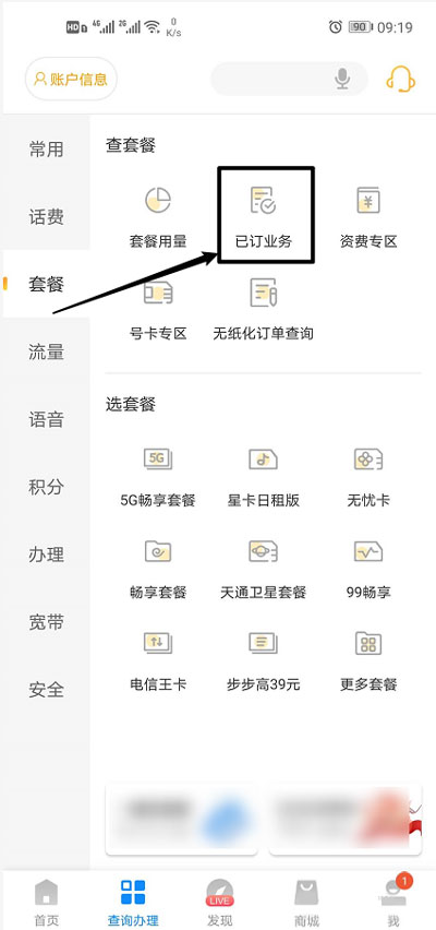 3、在套餐内,找到【已订业务】功能,点击进入查看所有已定业务;