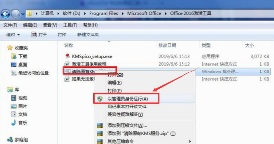 1.首先,我们将office 2016激活工具kmspico文件夹打开,右键单击“清除原有KMS服务.bat”,并在右键菜单中点击“以管理员身份运行”。