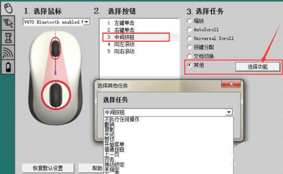 1.首先,进入Logitech Setpoint设置页面。先设置鼠标按钮。例如我们选择“中间按钮”,点击“选择功能”按钮,弹出“选择任务”窗口,根据自己的需要来设置该按钮的动作。