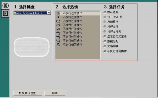 2.然后,我们再设置Logitech Setpoint的热键和F键。先根据自己需要选择热键,再设置它对应的任务选项。同样的,切换至F键的设置页面,也可以为它选择相应的任务。