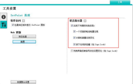 3.接下来,我们还可以设置Logitech Setpoint的状态指示器。比如说当电脑的电量不足、音量变化、按锁定键时有提示的话,就可以勾选“一个设备的电池电量过低”、“计算机音量出现变化”、“按下任何锁定键”这三项内容。