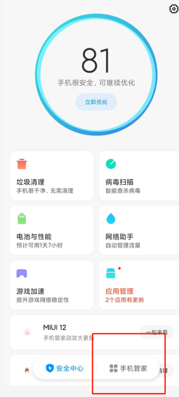 打开小米手机,进入界面,点击【手机管家】,进入安全中心,然后点击切换至【手机管家】,